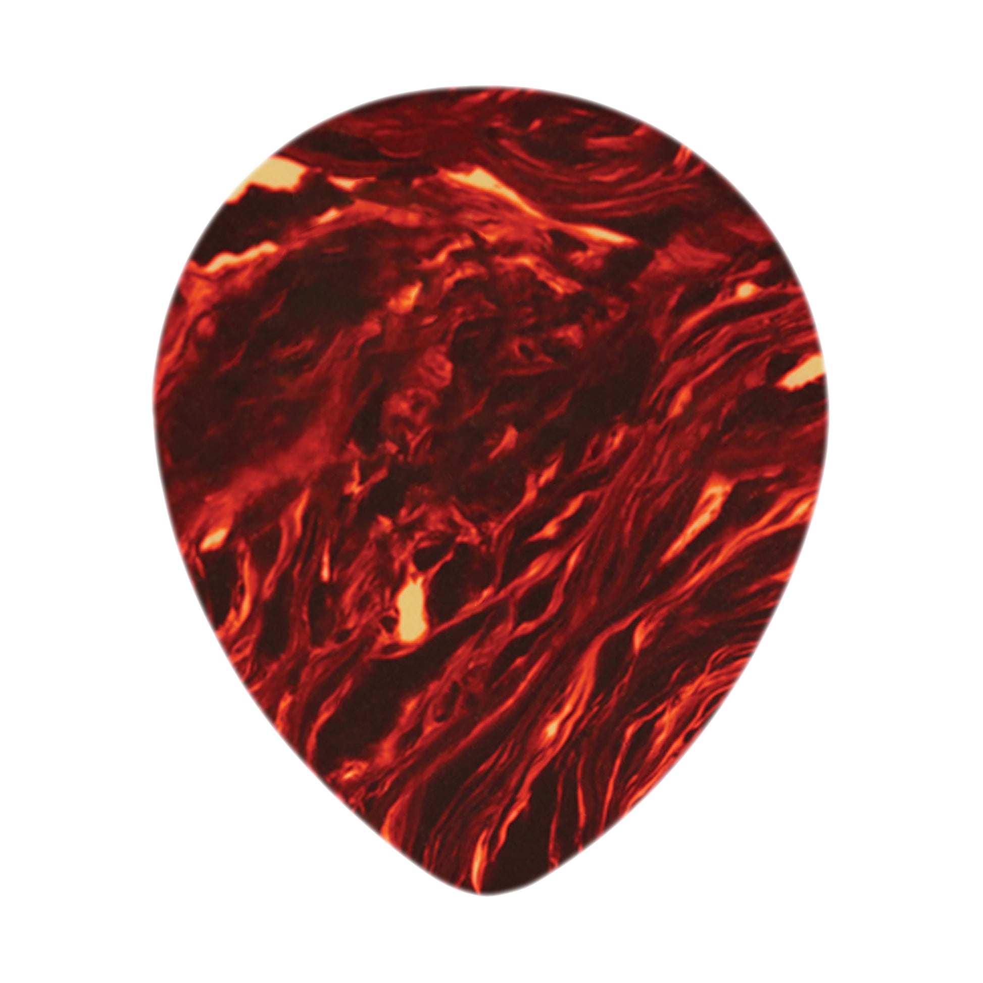 Celluloid closely mimics the tonal qualities of a genuine tortoise shell pick, but with greater durability, and at a far lower cost. Celluloid can be made in virtually any color or shape, and can be opaque or transparent, which allows many interesting colors and designs to be created. Celluloid ultimately became the go to choice for making guitar picks due to its value, tonal qualities, durability, and the wide variety of designs possible.